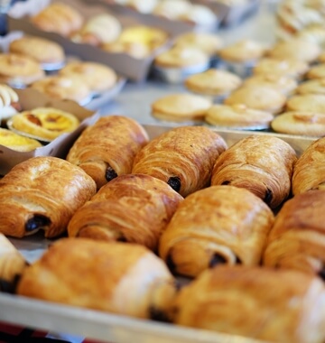 Diferentes tipos de pastelaria: croissants, macrons, pretzels, cannoli, strudels, tartes, donuts, scones e muitos outros.