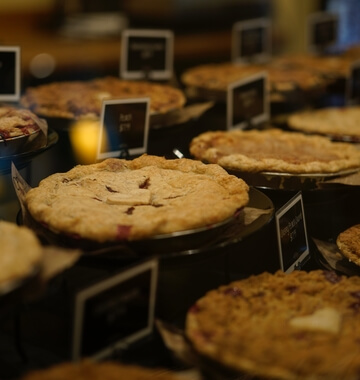Torta de cereja, torta de maçã, torta de abóbora, torta de canela com crosta de nozes, torta de manteiga, torta de merengue de limão, cheesecake e outros.